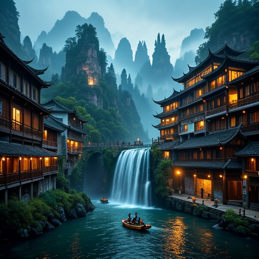 芙蓉镇则以其悬挂在瀑布上的古镇景观闻名。瀑布从悬崖倾泻而下,水声轰鸣,雾气升腾。土家族吊脚楼依山而建,层层叠叠,与瀑布相映成趣。走在古镇的青石板街上,品尝一碗正宗的米豆腐,感受刘晓庆电影《芙蓉镇》里的生活气息,时光仿佛在这里慢了下来。